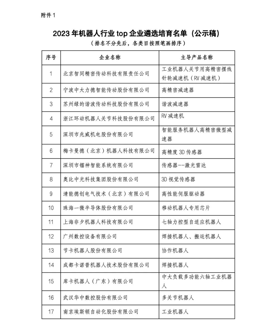 附件1:2023机器人行业TOP企业遴选培育名单(公示稿)