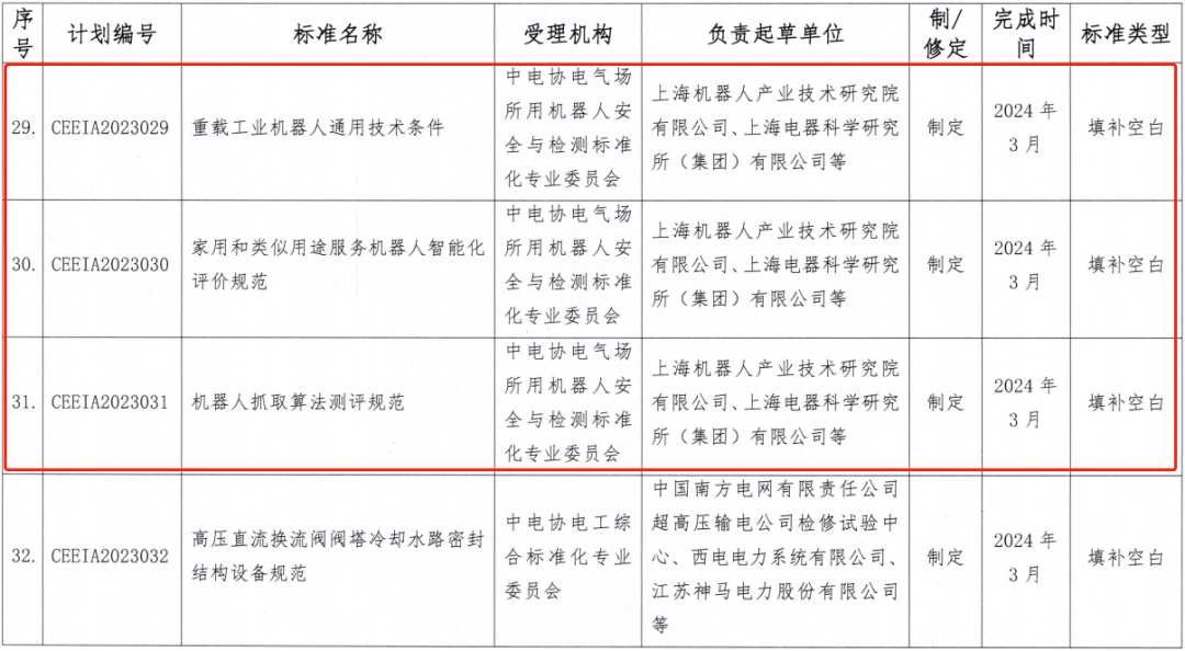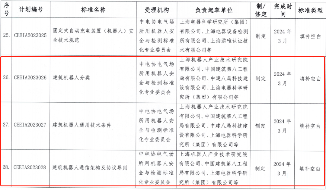 2023年3月27日,中电协[2023]64号《关于下达2023年第一批中电协团体标准制定计划的通知》,下达了中电协团标《建筑机器人分类》、《建筑机器人通用技术条件》、《建筑机器人通信架构及协议导则》、《重载工业机器人通用技术条件》、《家用和类似用途服务机器人智能化评价规范》、《机器人抓取算法测评规范》(发文序号26~31)。
